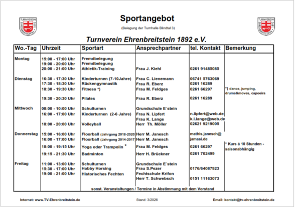 Der TV Ehrenbreitstein ist ein Turnverein mit Tradition und Zukunft, ein Verein mit langer Geschichte und vielen engagierten Mitgliedern. Er ist Sportstätte für Jung und Alt und bietet vornehmlich Freizeit- und Gesundheitssport an.
