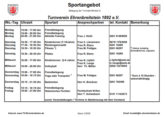 Das Übungs- und Trainingsangebot ist vielseitig und umfasst traditionelle Sportarten ebenso wie Trendsportarten. Die Trainingsstunden und Kurse werden von erfahrenen Übungsleiterinnen und -leitern durchgeführt. Neben den sportlichen Aktivitäten wird auch die Geselligkeit gepflegt. Der TV Ehrenbreitstein unterhält eine eigene Turnhalle im Blindtal.